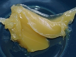 Looks pretty much like beeswax, smells close, but different.. not unpleasant, kind of a waxy product smell if there is a thing. Getting into it, it's got the wax consistency but not quite as sticky and it softens up a lot quicker when you get it working in your palms.